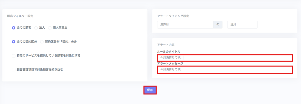 5.アラートの「タイトル」「メッセージ」を入力し、保存をクリックします。