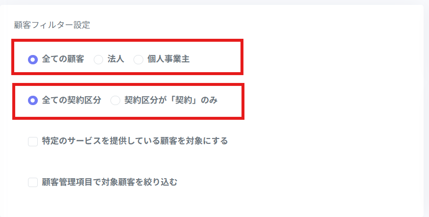 3.「顧客区分」「契約区分」を選択し、顧客フィルターを設定します。