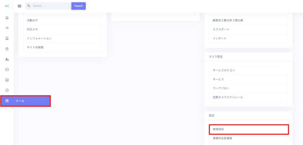 1.[≡](メニュー)>[ツール]>設定[管理項目]をクリックします。