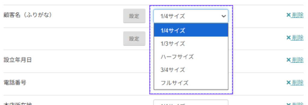 各項目のボックスサイズ(1/4サイズ/ハーフサイズ/フルサイズ等)を設定できます。