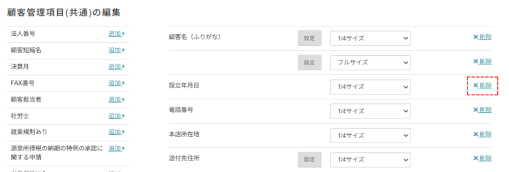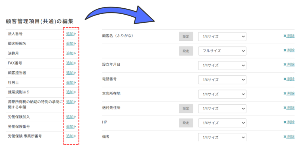 右側の一覧は、すでに顧客管理画面に反映されている項目です。