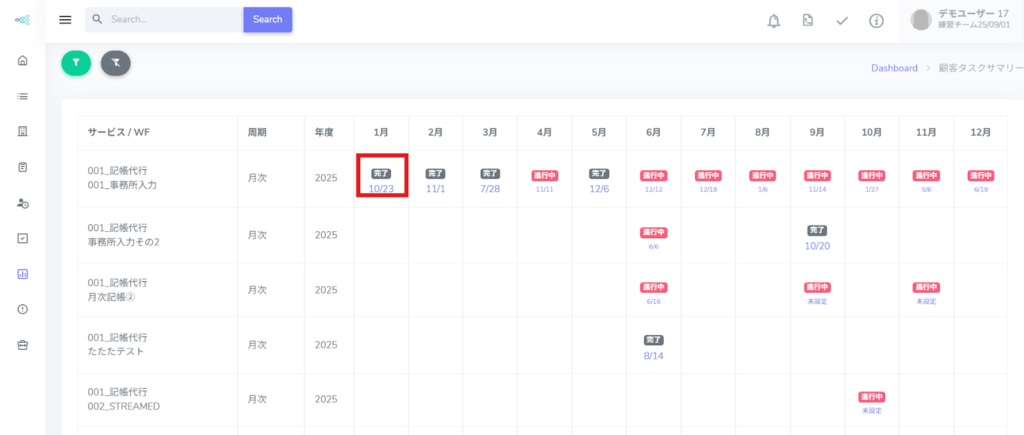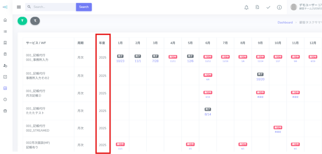 ※顧客ごとに、年次タスクの実施状況を一覧で確認できます。