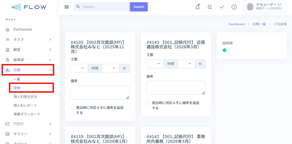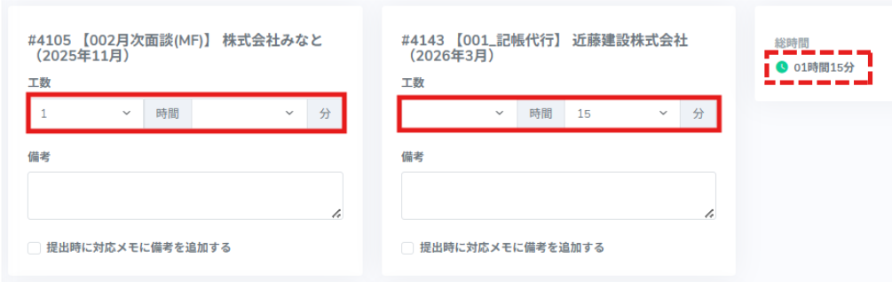 入力した内容に応じて、画面右側の 「総時間」 に自動で合計時間が反映されます。