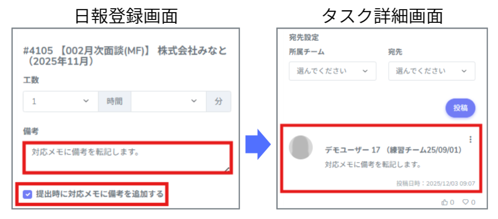日報作成時に「備考」に入力した内容は、日報提出時に顧客の対応メモへ転記することができます。