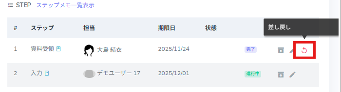 ステップの内容に修正が必要な場合や、前の担当者へ戻したい場合に、ステップを差し戻す操作を行います。