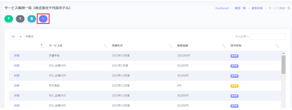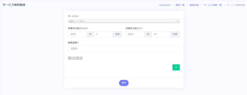 顧客詳細画面から顧客毎にサービスの報酬を登録することが出来ます。