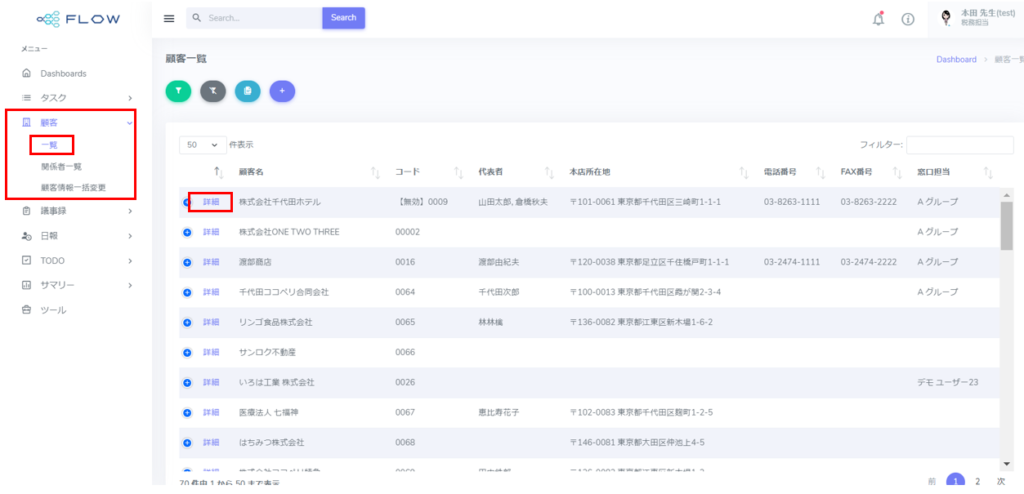 1.「顧客」>「顧客一覧」より当該顧客の「詳細」をクリックします。
