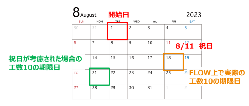 ▼ 工数10の場合(8月11日が祝日)