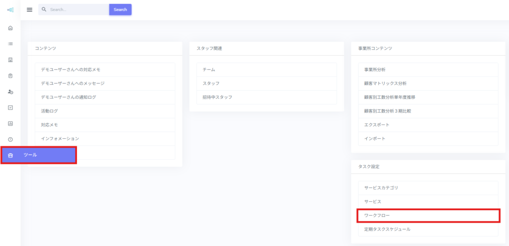 1.[≡](メニュー)>[ツール]>タスク設定[ワークフロー]をクリックします。