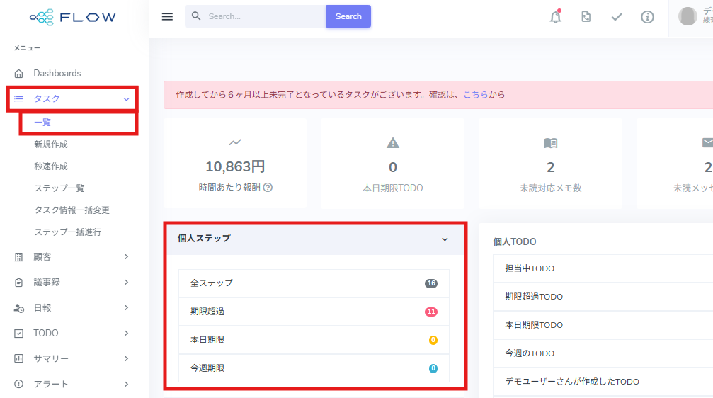 1.[≡](メニュー)>[タスク]>[一覧]をクリック、 または、[Dashboard]内の「個人ステップ」の対象タスクをクリックしても開けます。