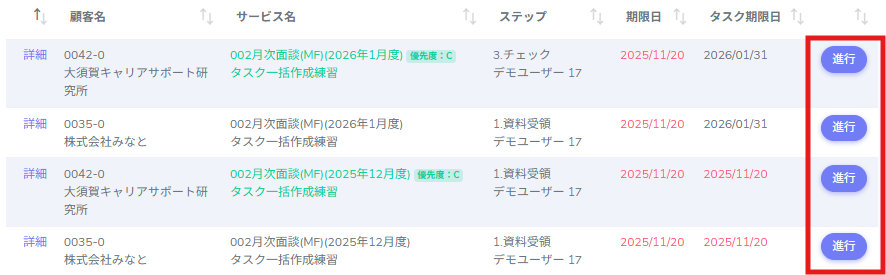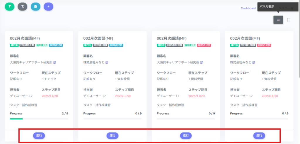 2.進めたいタスクの[進行]をクリックします。