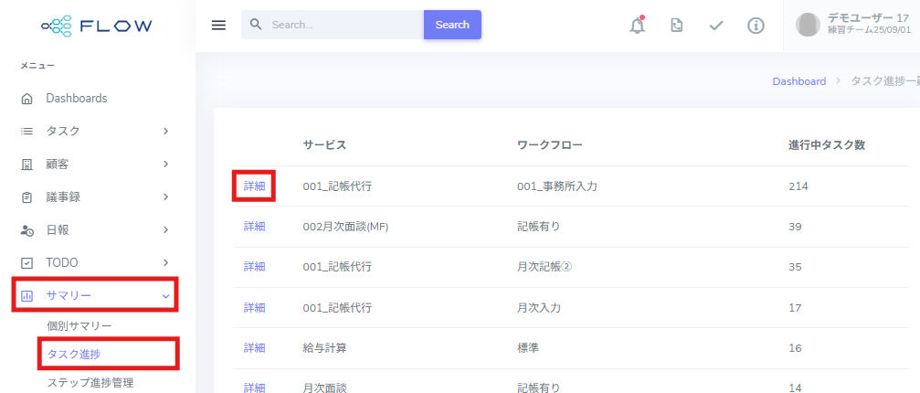 1.[≡](メニュー)>[サマリー]>[タスク進捗]をクリックし、進めたいワークフローの[詳細]をクリックします。