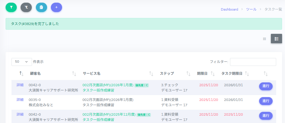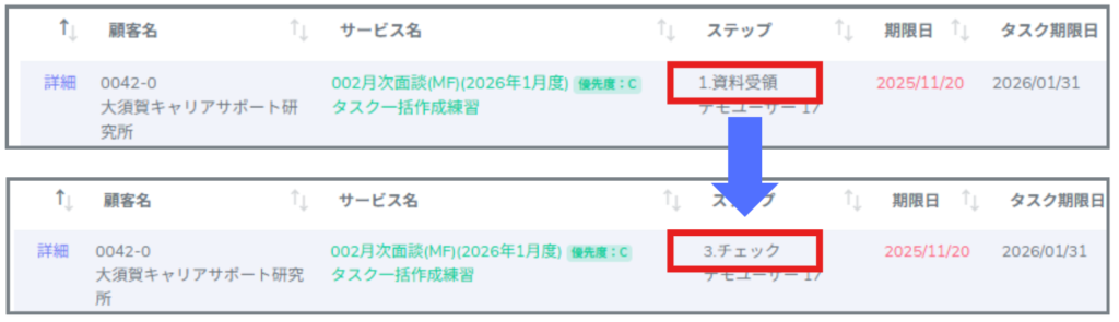 ※ステップを強制的に完了させたい場合は、【タスク】タスクの強制完了をご参照ください。