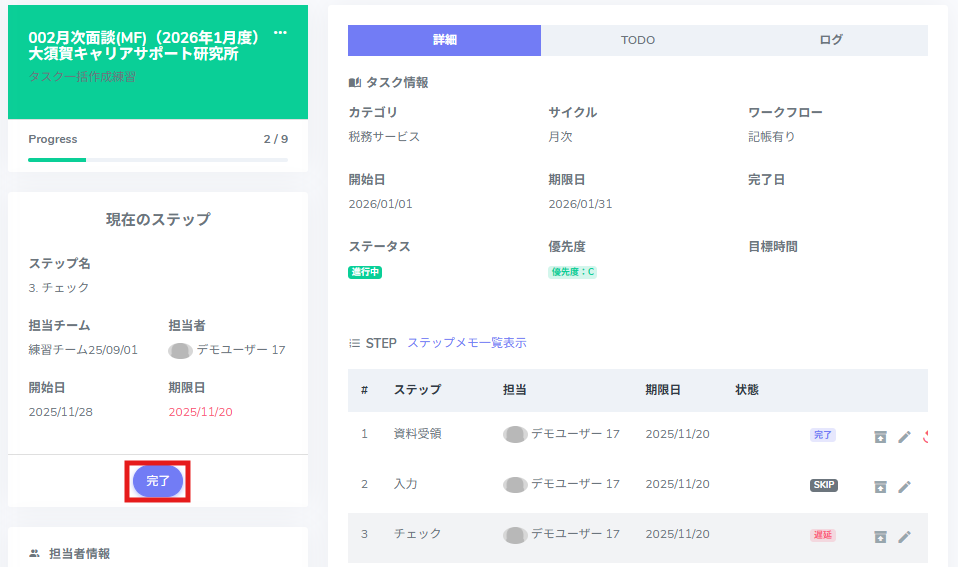 タスクは複数のステップで構成されており、各ステップを進めることでタスクが完了します。