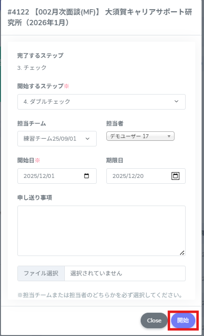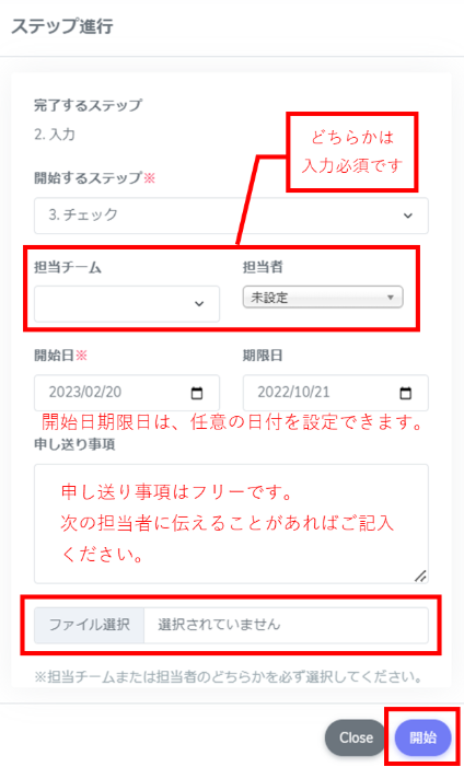 6.次に開始するステップ・担当者・開始日などを設定し、[開始]をクリックします。