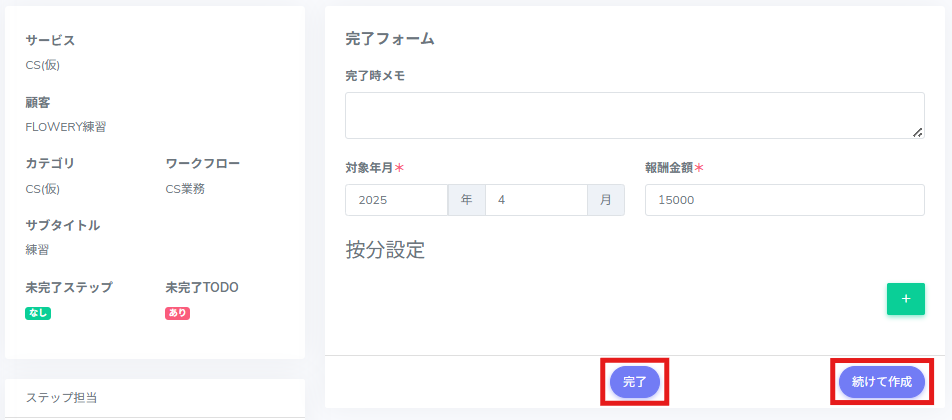 2.完了フォームを入力し、[完了]または[続けて作成]をクリックします。