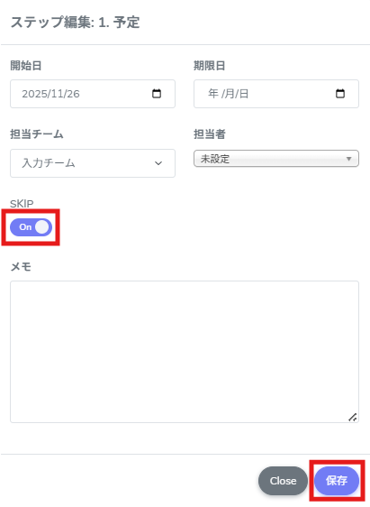そのステップをSKIPとして設定することで、作業を行わずに完了扱いにできます。