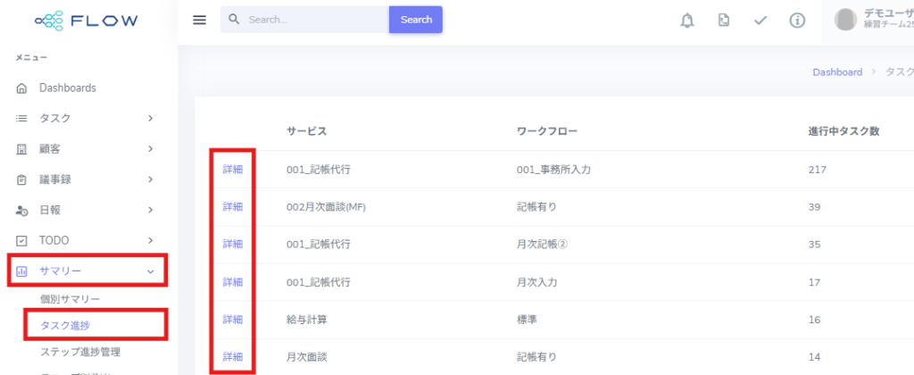 タスクの進行状況を顧客別・サービス別に一覧で確認できます。