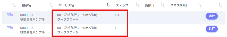 以下の例では、同一サービスにワークフローAとワークフローBがあるため、 同じ対象月に2件のタスクが作成されています(AとBそれぞれ1件ずつ)。