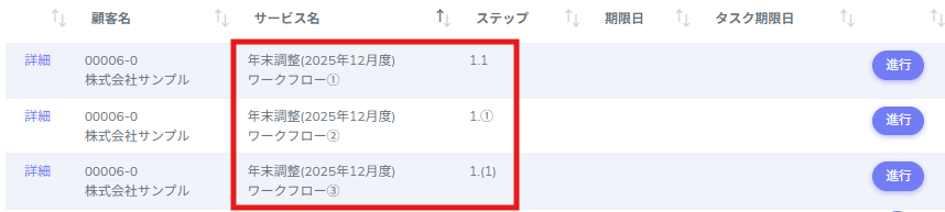 以下の例では、同一サービスにワークフローが3つあるため、 同じ対象年に3件のタスクが作成されています(1ワークフローにつき、1件ずつ)。