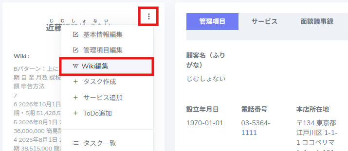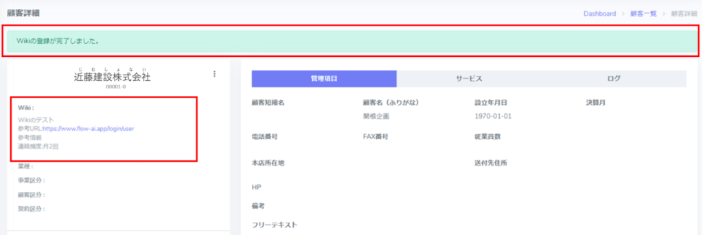 4.顧客詳細画面の画面左上「Wiki」に表示されます。